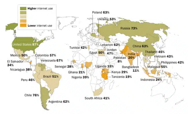 These are some of the findings of the Pew Research Center’s . The study updates a similar effort from 2013, which highlighted the strong levels of web usage and engagement for social and mobile users. The findings for the 2014 edition are drawn from in-person interviews with 36,619 people across 32 emerging and developing countries conducted from March 17 to June 5, 2014. The results for those 32 countries - including significant education markets such as China, India, Nigeria, Indonesia, Thailand, Vietnam, Brazil, and Mexico - have been benchmarked against a related Pew Center telephone survey of 1,002 Americans, also conducted in 2014.